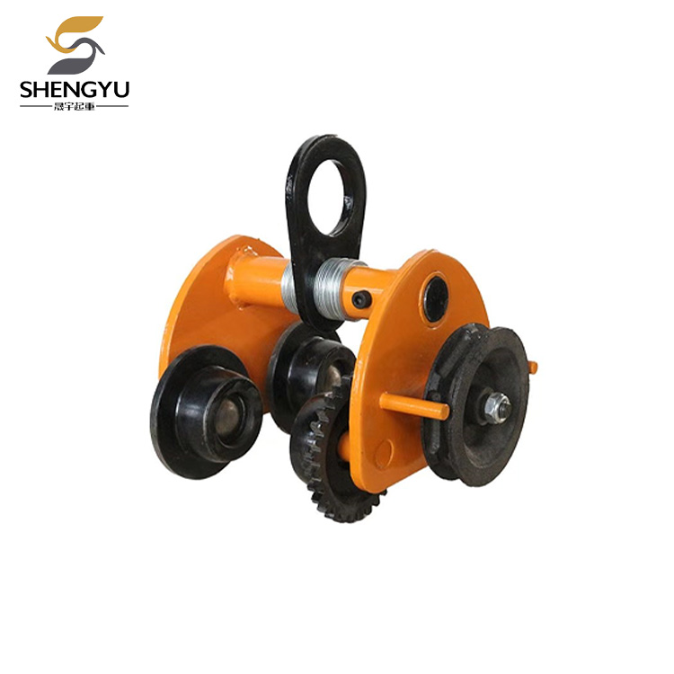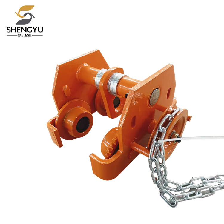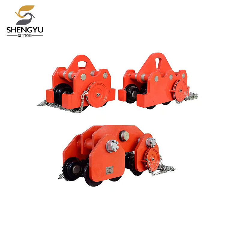 Impulsados por una cadena manual, viajan a lo largo del borde inferior de la vía de la viga en I. Cuando está equipado con un polipasto de cadena, sirve como punto de suspensión móvil para equipos de elevación. De esta manera, el carro con engranajes no sólo puede levantar objetos pesados verticalmente sino que también permite el movimiento hacia izquierda y derecha de objetos pesados.